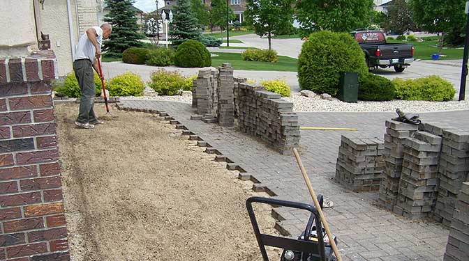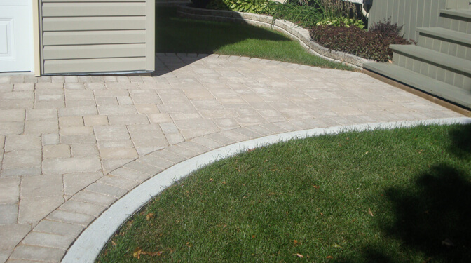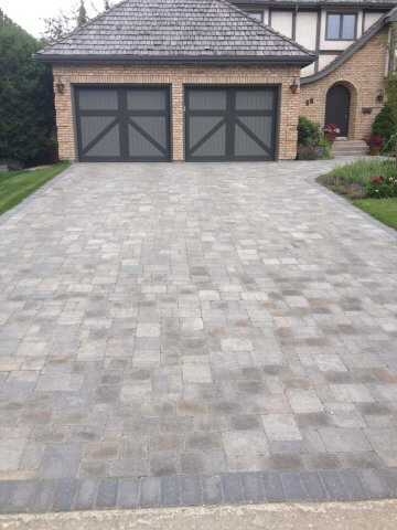 Driveways require a similar preparation method to patios. However, generally you will require at least twice the amount of base material (minimum 12 inches). Although paving stone driveways can be laid without a poured concrete curb border we highly recommend that it is done to prevent the pavers from slowly sliding over time. Similar in method to the construction of our patios the base is laid and machine compacted several times before a final layer is screeted and the pavers are laid, sanded from the top and machine compacted once again.
