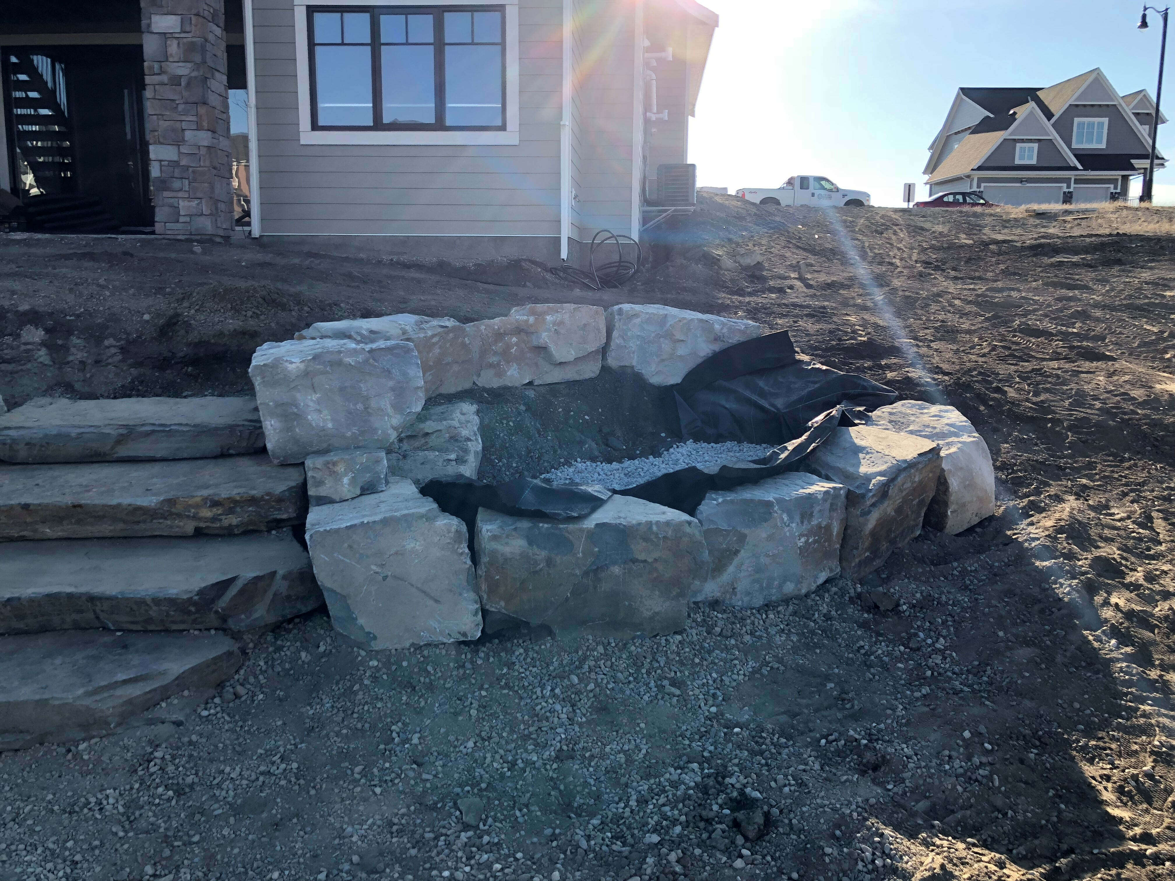 The process involves digging a trench to the approximate shape of the desired wall. The trench is filled with appropriate granular base then machine compacted several times. Almost without exception it is necessary to do considerable cutting of stones to do a proper job.